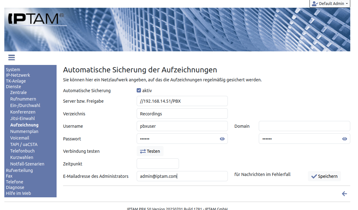 In bestimmten Situationen kann es erforderlich sein, aufgezeichnete Anrufe zu archivieren. Ihre IPTAM® PBX bietet die Möglichkeit, aufgezeichnete Anrufe regelmäßig auf ein externes Speichermedium zu exportieren.