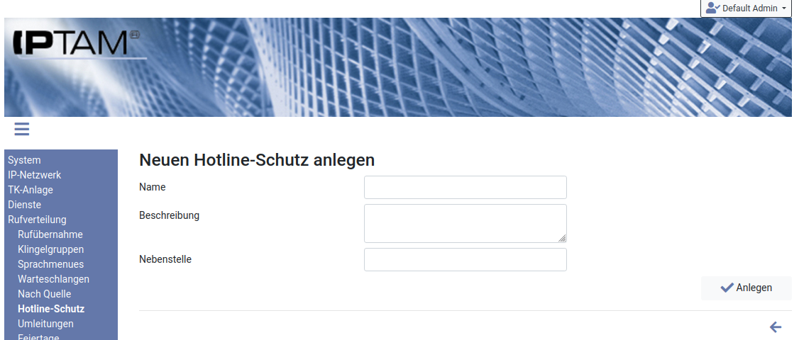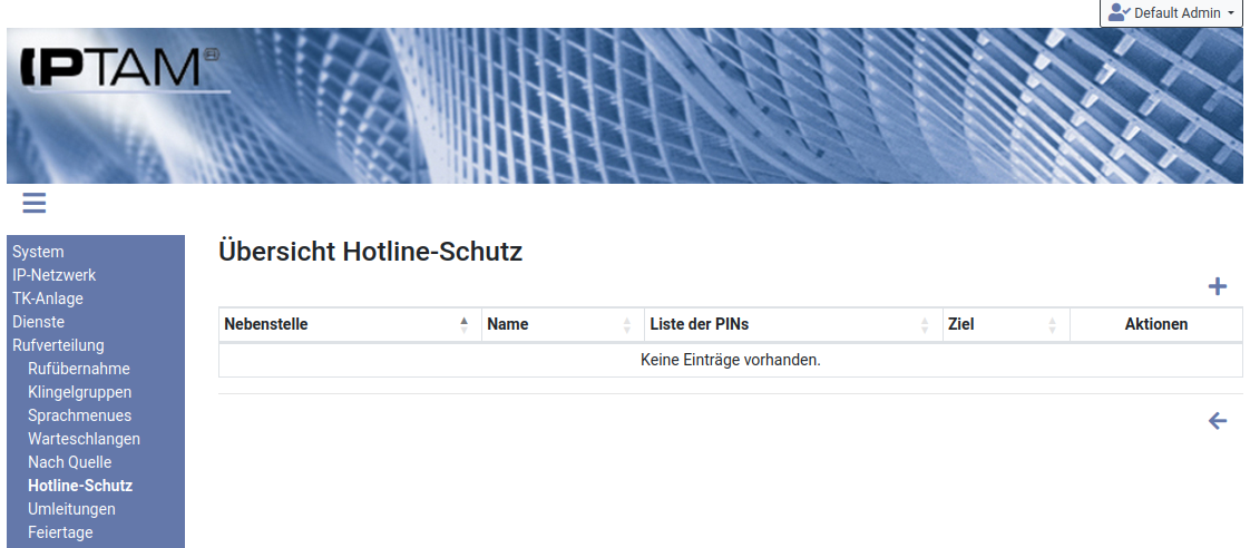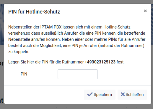 Sie können zu jeder internen Nebenstelle in Ihrer IPTAM® PBX eine Schutzfunktion einrichten, die vom Anrufer die Eingabe einer PIN erfordert. Anrufer hören dann eine passende Ansage. Nach einer einstellbaren Zahl von Fehlversuchen wird die Verbindung getrennt.