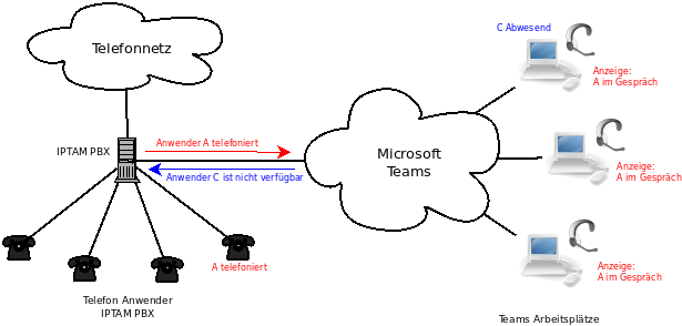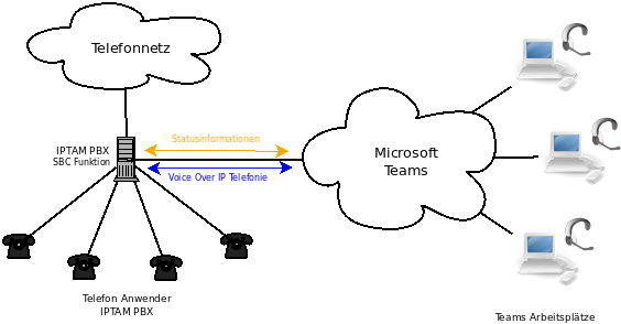 Die Teams Plattform von Microsoft hat sich (insbesondere während der Pandemie) in vielen Unternehmen als unverzichtbare Kommunikations- und Kollaborationslösung etabliert. In vielen Fällen kommt die Lösung im Wesentlichen zur internen Kommunikation oder zur Kommunikation mit Partnern zum Einsatz. Daneben wird die Telefonie für die externe Kommunikation und für klassische Funktionen der TK-Anlagen betrieben. Dies führt dazu, dass bei Anwendern zwei Endgeräte konkurrieren: Der Teams-Client und das Telefon. Der Zustand von beiden Geräten ist dem jeweils anderen unbekannt, so dass während eines Telefonats der Teams-Client Aufmerksamkeit erfordert oder während einer Videokonferenz das Telefon klingelt. Die Lösung für dieses Problem ist die Statuskopplung zwischen der IPTAM® PBX und der Teams Plattform: Sie können festlegen, was mit Anrufen abhängig von Ihrem Zustand in der Teams-Plattform passieren soll (zum Telefon gelangen lassen, Besetzt signalisieren, Anruf umleiten). Während Sie telefonieren wird Ihr Teams-Zustand auf „Im Gespräch“ gesetzt, so dass Ihre Kollegen darüber informiert sind.Microsoft bietet bei entsprechender Lizenz die Möglichkeit, aus Teams heraus in das öffentliche Telefonnetz zu telefonieren und von dort aus erreichbar zu sein. Voraussetzung dazu ist neben der Lizenz ein Session Border Controller (SBC), der die Kopplung und funktionale Trennung der Microsoft Voice over IP Infrastruktur und der des Telefonnetzes übernimmt. Als ein solcher SBC kann Ihre IPTAM® PBX zum Einsatz kommen. Diese leistungsfähige Kopplung bietet Ihnen dann u.a. die folgenden Möglichkeiten: