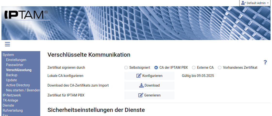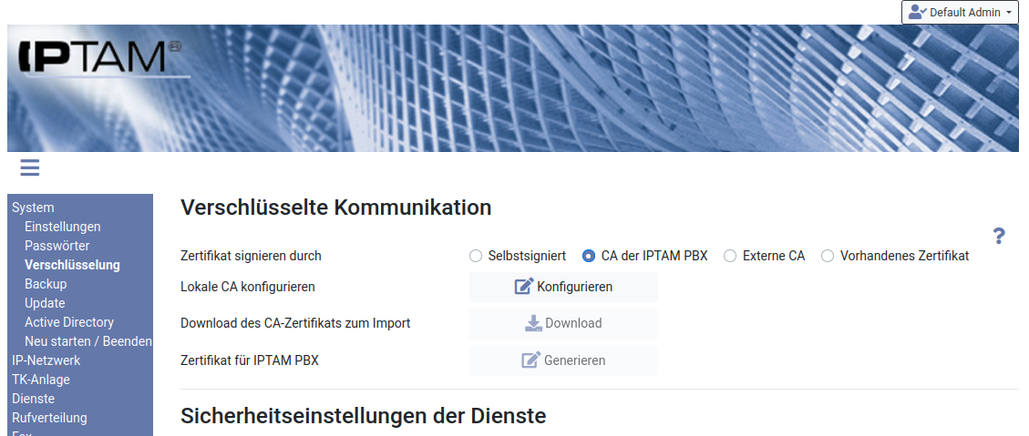 Die IPTAM® PBX bietet eine interne Zertifizierungsstelle (CA), um das Server-Zertifikat der Telefonanlage durch diese unterschreiben zu lassen. Um das Zertifikat dann verwenden zu können, müssen Sie die interne CA der IPTAM® PBX als vertrauenswürdige CA in Ihrem Browser bzw. Clients eintragen.