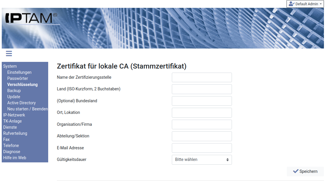 Image Tragen Sie im dargestellten Dialog die Daten des Zertifikats der internen Zertifizierungsstelle (CA) ein. Das Zertifikat muss die Informationen Land, Stadt, Organisation, Abteilung, E-Mail Adresse sowie eine Gültigkeitsdauer enthalten. Klicken Sie auf „Speichern“, um die Einstellungen zu übernehmen.
