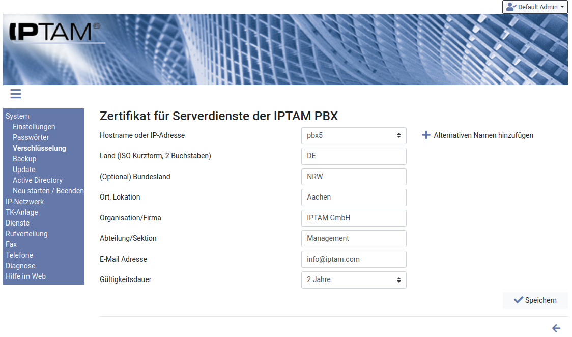 Image Sie benötigen nun noch das eigentliche Server-Zertifikat. Klicken Sie dazu auf „Generieren“. Sie sehen die Felder des Zertifikats, wobei diese mit denen des CA-Zertifikats vorbesetzt sind. Die Angabe unter „Hostname oder IP-Adresse“ verwenden Sie später in den URLs, wenn Sie die Web-Seite Ihrer IPTAM® PBX per HTTPS aufrufen (Wenn Sie im Zertifikat den Hostnamen verwenden und in den URLs später die IP-Adresse, wird Ihr Browser eine Sicherheitswarnung anzeigen, weil das Zertifikat nicht zur URL passt). Sie können einen oder mehrere weitere Namen als SANSubject Alternative Name