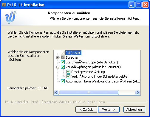 Es erscheint die in der Abbildung dargestellte Auswahl der zu installierenden Komponenten. Bestätigen Sie Ihre Einstellungen und gehen Sie mit „Weiter“ zur Auswahl des Installations-Ortes. Nach einem Klick auf „Installieren“ startet die Installation. Am Ende klicken Sie auf „Fertigstellen“.