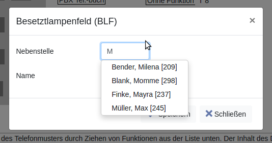 Image Bei Verwendung der BLF (Besetztlampenfeld) Funktion konfigurieren Sie eine Taste mit einer Nebenstelle, die Sie „beobachten“ wollen. Ankommende Anrufe lassen die Taste blinken und Sie können Gespräche heranholen. Sie können sehen, ob die betreffende Nebenstelle im Gespräch ist. Im dargestellten Dialog können Sie bei der Auswahl der Nebenstelle Vorschläge erhalten, wenn Sie Name und Nebenstelle beginnen zu tippen. Die eventuell erforderliche Tastenbeschriftung wird mit dem „Alias“-Wert des Anwenders vorbesetzt. Wenn Sie beim Konfigurieren Ihrer Anwender den Alias-Parameter setzen, können Sie sich also einige Tastendrücke sparen.