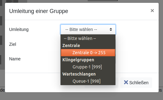 Image Möchten Sie Anrufe an die Zentrale, eine Klingelgruppe oder Warteschlange auf Knopfdruck umleiten (bevor die Anrufe in die Gruppe gelangen), so können Sie die Funktion „Gruppen-Umleitung“ auf eine Taste legen. In dem Dialog wählen Sie die betreffende Gruppe aus und legen optional ein Ziel fest. Wenn Sie kein Ziel festlegen, wird dieses immer beim Aktivieren abgefragt. Die LED spiegelt den Zustand wider.