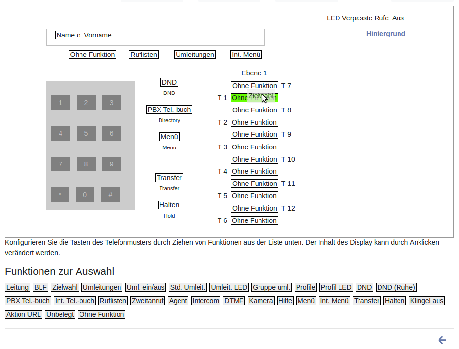 Image Klicken Sie auf die gewünschte Funktion aus der Liste und ziehen Sie sie auf eine Taste (Drag&Drop) des Telefons. Die Taste verfärbt sich grün, andernfalls ist die gewählte Funktion auf der vorgesehen Taste nicht möglich. Sofern keine weiteren Eingaben erforderlich sind, ist die Taste jetzt für die gewählte Funktion vorgesehen. Wollen Sie die Belegung ändern, ziehen Sie einfach die neue Funktion auf die Taste. Möchten Sie eine Funktion wieder löschen, ziehen Sie den Button „Ohne Funktion“ auf die entsprechende Taste.