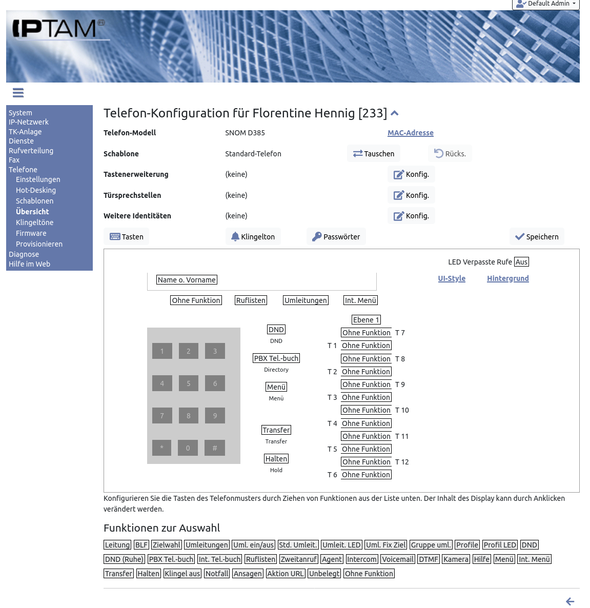 Image Die Tastenbelegung der Telefone können Sie bei Schablonen (als Basis für mehrere Telefone) oder bei der Konfiguration eines Telefons bearbeiten. Falls Anwender die Telefone selbst konfigurieren dürfen, stehen die Einstellungen auch im persönlichen Web-Portal der Anwender zur Verfügung. Links ist als Beispiel ein Snom D385 dargestellt. Unterhalb der stilisierten Telefondarstellung sehen Sie eine Liste von Funktionen.