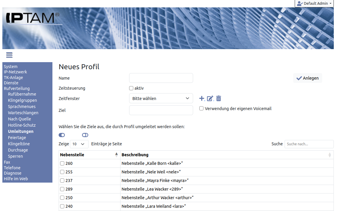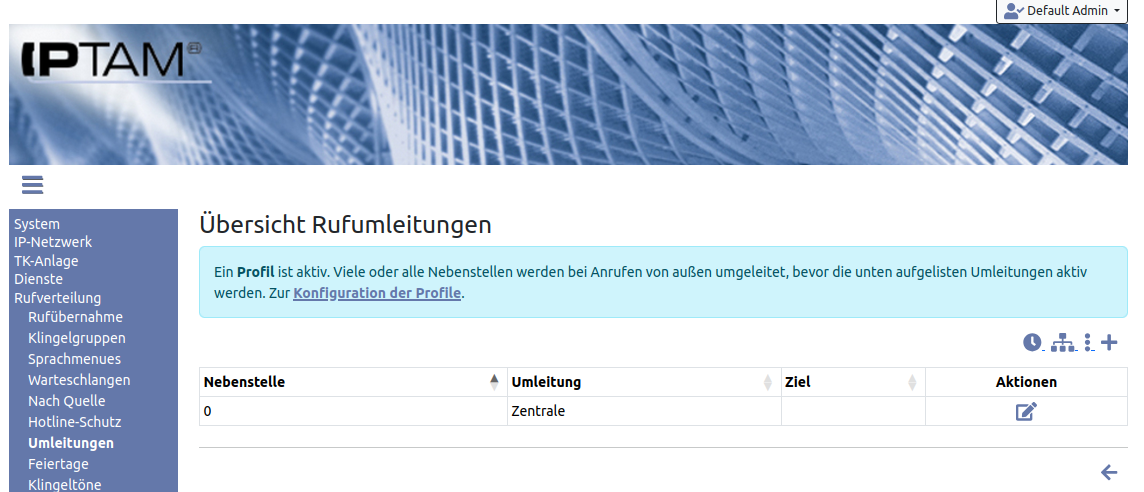 Mit einem Profil können externe Anrufe an eine oder mehrere Nebenstellen (Anwender, Warteschlangen, Sprachmenüs, Klingelgruppen, etc) zu einem Ziel umgeleitet werden. Ein Profil kann zeitgesteuert oder manuell ein und ausgeschaltet werden. Auch eine Kombination ist möglich.So können während Betriebsferien alle Anrufe auf eine Ansage oder eine Voicemail geleitet werden, ohne dass dies für jede Nebenstelle einzeln eingestellt werden muss. Oder zum Feierabend schaltet der letzte Mitarbeiter die Umleitung für alle bis auf die Hotline auf eine Ansage. Der erste am Morgen schaltet das Profil wieder aus.