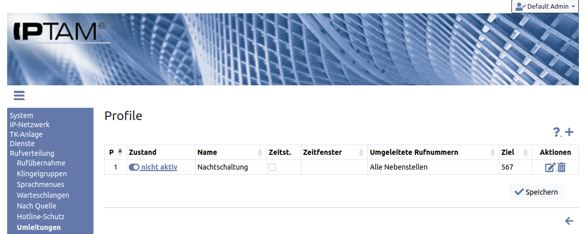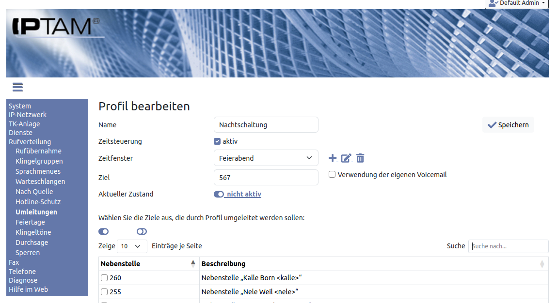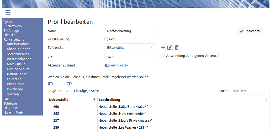 Als Beispiel ist hier das Profil „Nachtschaltung angelegt“ angelegt. Die Umleitung erfolgt auf die Nebenstelle „567“. Wählen Sie jetzt noch die umzuleitenden Nebenstellen aus, z.B. indem Sie das Icon anklicken, um alle Nebenstellen auszuwählen. Durch Speichern gelangen Sie wieder in die Übersicht.