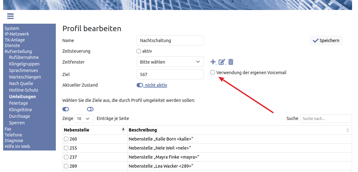 Beispiel: Ein Profil leitet Anrufe einiger Nebenstellen auf „567“. Dort ist eine Umleitung auf die Mailbox aktiv. Externe Anrufer an z.B. „123“ werden auf die Voicemail der Nebenstelle „567“ geleitet. Wenn Sie die Checkbox aktivieren wird ein Anruf an „123“ auf die Mailbox von „123“ geleitet.