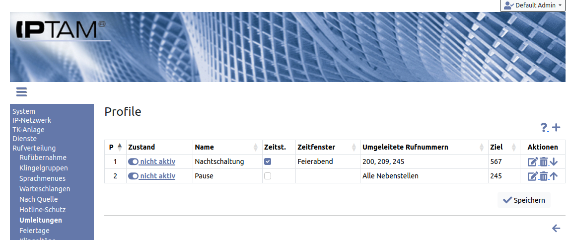 Es können mehrere Profile angelegt und aktiviert werden. Ein Profil kann zeitgesteuert oder manuell vom Administrator sowie über die Telefon-Funkion „Profile“ oder „Profil-LED“ ein- und ausgeschaltet werden.