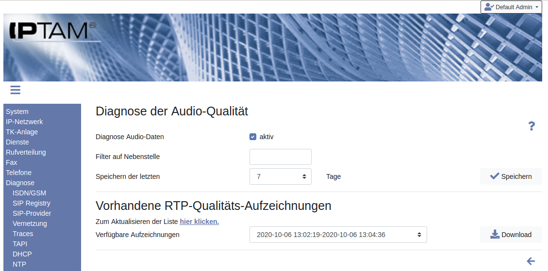 Für die Audio-Qualität maßgeblich ist es, dass die per RTP übertragenen Audiodaten möglichst vollständig und regelmäßig übertragen werden. Paketverlust und Schwankungen in der Übertragungsdauer (Jitter) führen zu Einschränkungen. Sollten Sie Probleme in diesem Bereich beobachten, können Sie im Menü Diagnose►Audio-Qualität Aufzeichnungen zur Qualität der extern geführten Gespräche aktivieren.