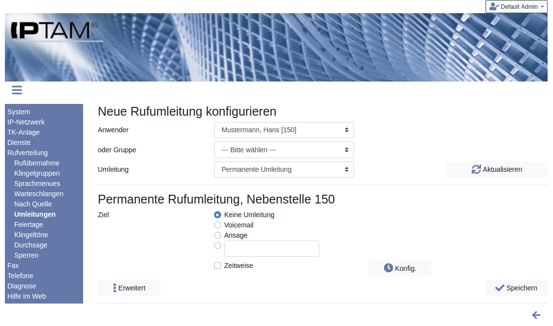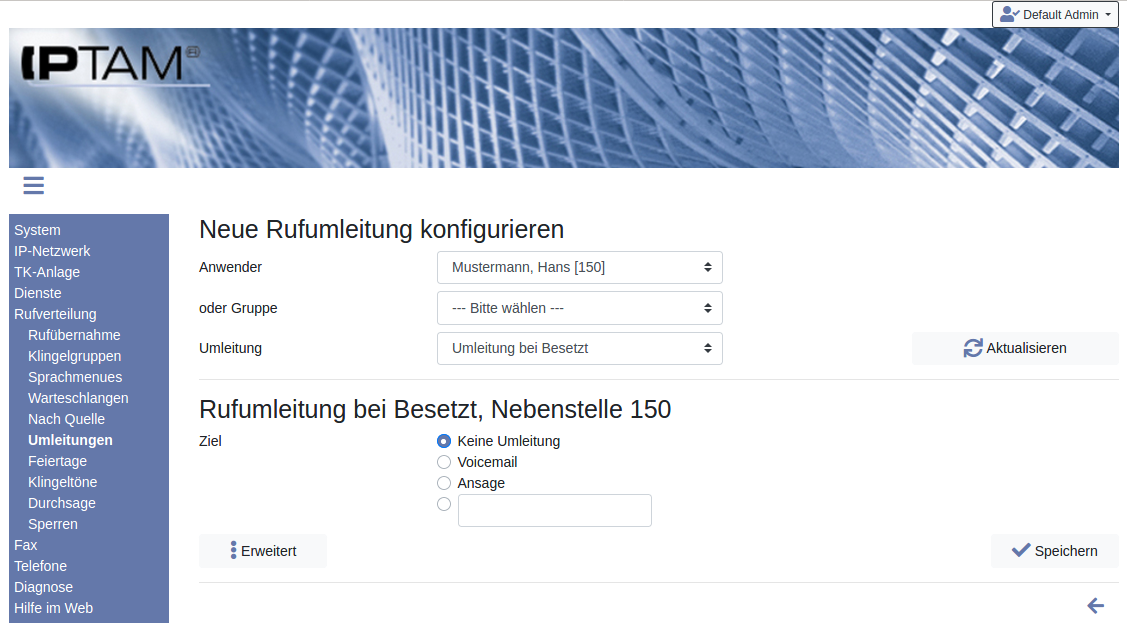 Die IPTAM® PBX verfügt über unterschiedliche Rufumleitungsszenarien. Die Umleitung leitet den Anrufer jeweils zu einer anderen Nebenstelle, einem externen Ziel, dem Anrufbeantworter des Anwenders oder zu einer Ansage. Es werden nur Anrufe umgeleitet, die direkt an einen Anwender gerichtet sind:- Permanente Umleitung