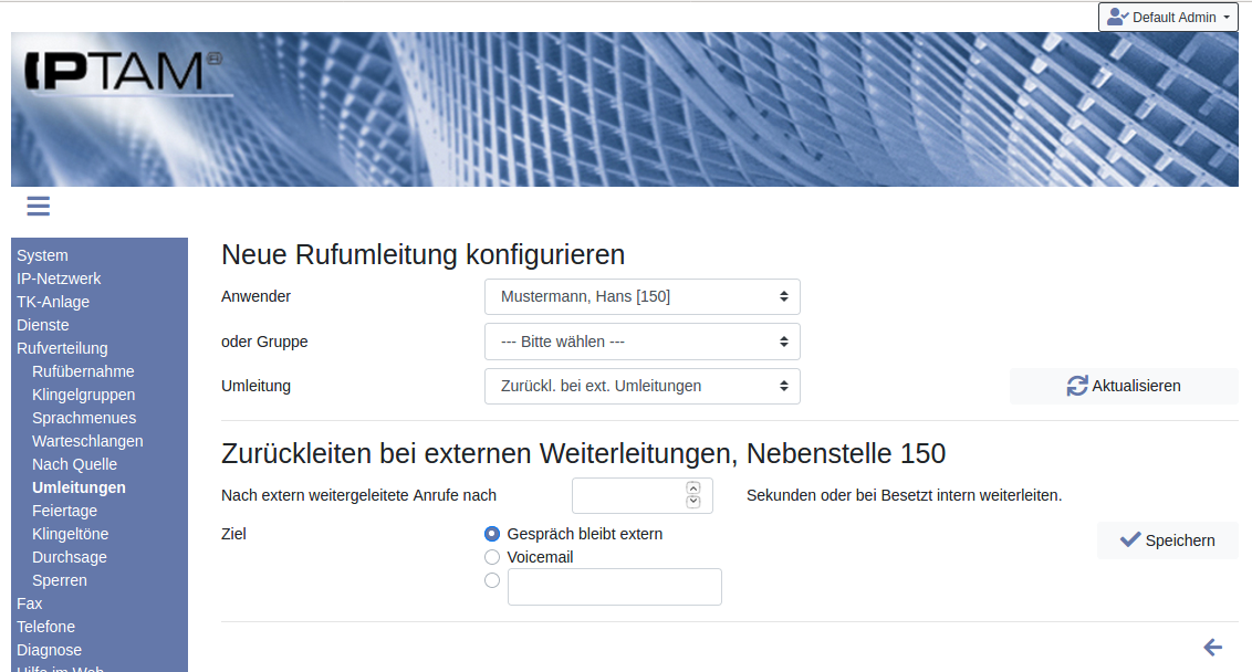 - Wenn bei einem Anwender Anrufe an ein externes Ziel umgeleitet werden (durch eine der anderen hier genannten Umleitungen) und das Gespräch am Ziel nicht angenommen wird, kann das Gespräch zur Voicemail oder zu einem neuen Ziel in der IPTAM PBX geleitet werden.