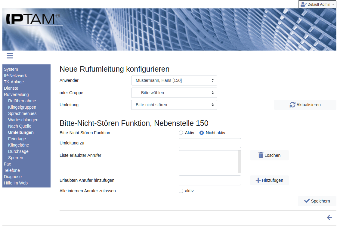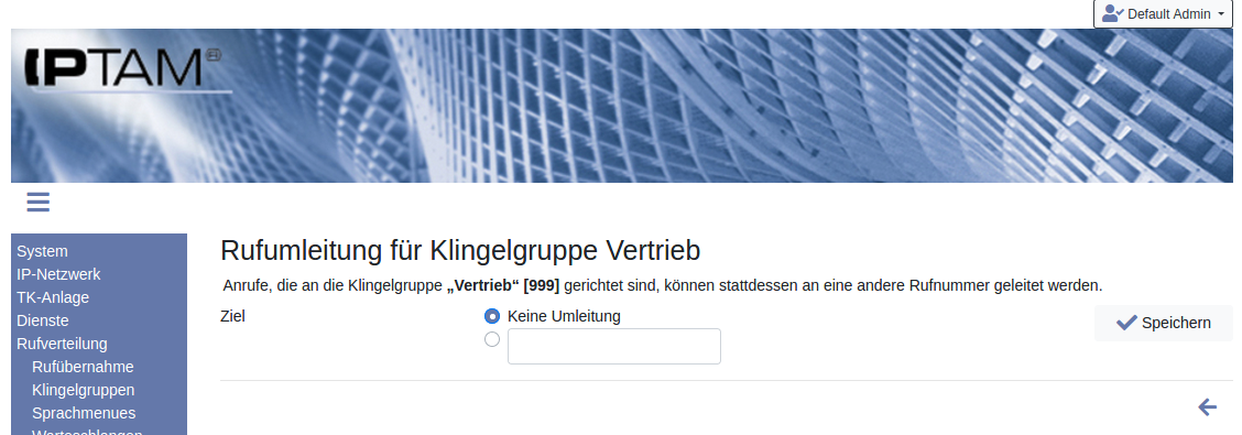 Jeder Anwender Ihrer IPTAM® PBX kann seine persönliche telefonische Erreichbarkeit durch unterschiedliche Umleitungen steuern (siehe dazu auch Abschnitt 3 „Rufumleitungen“ im Anwenderhandbuch). Darüber hinaus können Anrufe an Gruppen von Anrufern (Warteschlangen, Klingelgruppen) umgeleitet werden.Der Administrator kann im Menü Rufverteilung►Umleitungen eine Übersicht aller aktiven Umleitungen in der Telefonanlage einsehen sowie diese ändern oder neu konfigurieren. Neben den Umleitungen der Anwender werden auch die Weiterleitungen aus Warteschlangen und Klingelgruppen hier aufgelistet, so dass der Administrator an einer Stelle alle Umleitungen im Blick hat.
