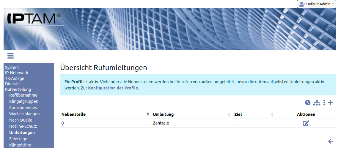 Mit einem Profil können externe Anrufe an eine oder mehrere Nebenstellen (Anwender, Warteschlangen, Sprachmenüs, Klingelgruppen, etc) zu einem Ziel umgeleitet werden. Ein Profil kann zeitgesteuert oder manuell ein und ausgeschaltet werden. Auch eine Kombination ist möglich. Die Funktion ist in diesem Abschnitt beschrieben. Der Einsatzzweck sind z.B. Nachtschaltungen, Betriebsferien etc.Administration der Rufumleitungen