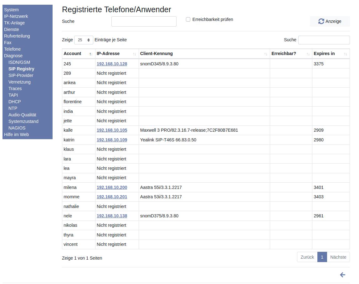 In der Tabelle kann es vorkommen, dass Endgeräte bei einem Anwender mehrfach mit gleicher IP-Adresse aber unterschiedlicher (Rest-)Laufzeit auftauchen. Das ist kein Fehler. Der Zustand tritt z.B. ein, wenn bei einem Telefon mit Verschlüsselung die TCP-Verbindung unterbrochen wird oder wenn ein Telefon neu gestartet wird. In diesen Fällen bleibt die frühere Registrierung erhalten und eine neue erscheint. Die ältere verschwindet aber nach dem Ablauf der Zeitspanne.