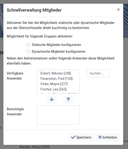 Durch den Link „Schnellverwaltung Mitglieder“, der sich in der Konfiguration von Klingelgruppen und Warteschlangen befindet, öffnet sich der links dargestellte Dialog. Im oberen Abschnitt können Sie festlegen, welche Optionen dem Administrator aus der Übersicht heraus möglich sind. Im unteren Abschnitt können Sie festlegen, welche Anwender die gleichen Optionen erhalten.