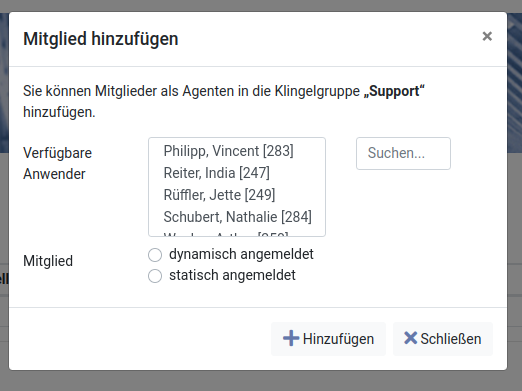 Im Normalfall konfiguriert der Administrator die Mitglieder bzw. Agenten von Klingelgruppen und Warteschlangen. Dazu muss jeweils die Klingelgruppe oder Warteschlange zum Bearbeiten geöffnet werden. Außerdem können Agenten sich dynamisch über das Telefon an- und abmelden.