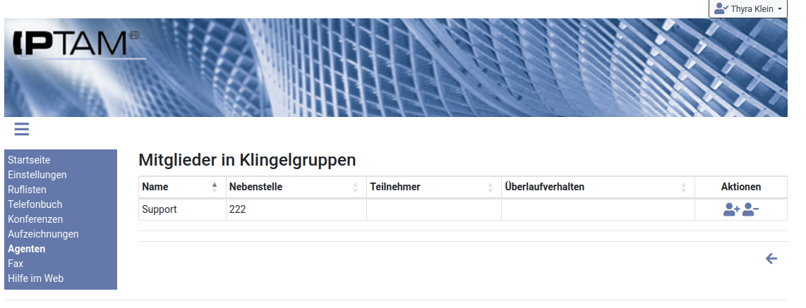 Wenn Sie Anwendern die Konfiguration der Agenten gestatten erscheint bei diesen in der Navigation der Menüeintrag „Agenten“ (siehe auch Anwenderhandbuch). Darin werden dann die Klingelgruppen und Warteschlangen aufgelistet, an denen die Berechtigung für die Agentenverwaltung eingeräumt wurde. Die Icons