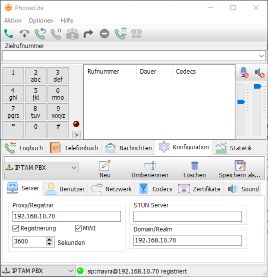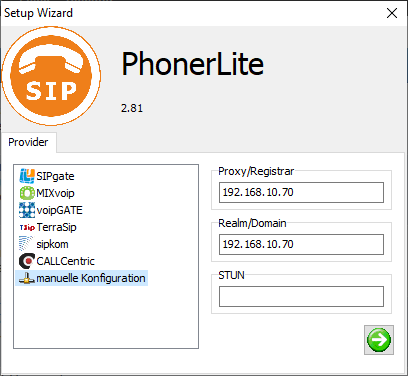 Image Image Beim ersten Start sehen Sie den „Setup Wizard“. Wählen Sie „manuelle Konfiguration“ und tragen Sie bei „Proxy/Registrar“ und „Realm/Domain“ jeweils die IP-Adresse Ihrer IPTAM® PBX ein (linke Abbildung). Übernehmen Sie die Einstellungen.
