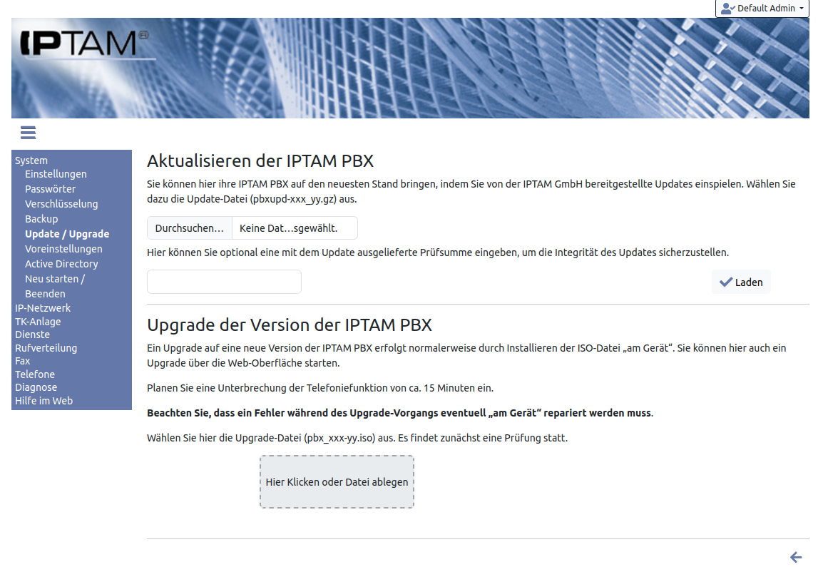 Image Unter System►Update können Sie Update-Pakete in Ihre IPTAM® PBX einspielen, die Ih­nen die IPTAM GmbH im Rahmen der Softwarewartung zur Verfügung stellt.