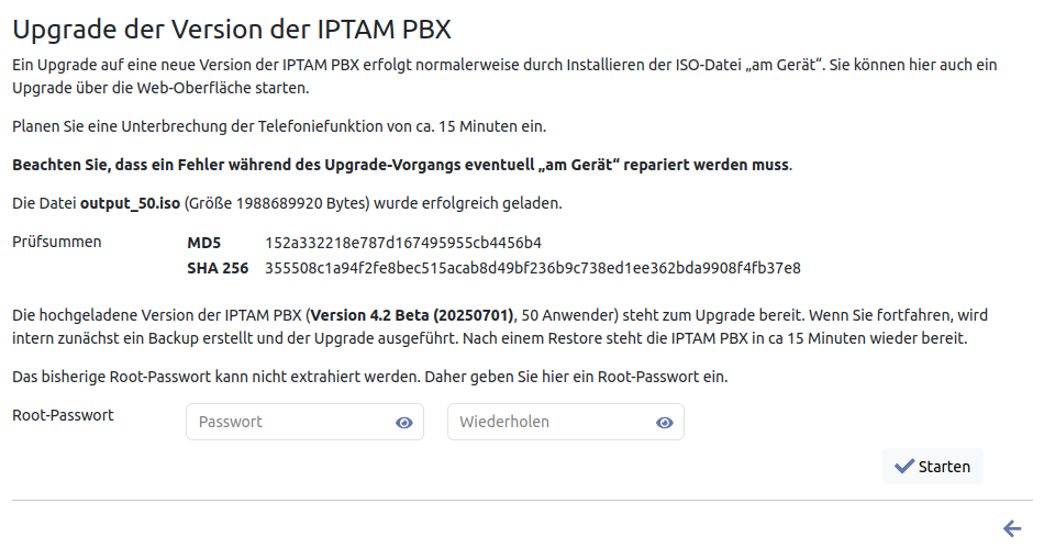Image Die ISO-Datei laden Sie über die Schaltfläche „Hier Klicken oder Datei ablegen“ (siehe Abbildung oben) auf Ihre IPTAM® PBX. Nach dem Laden sehen Sie den Erfolg wie rechts dargestellt. Sie sehen Prüfsummen, mit denen Sie den korrekten Upload kontrollieren können sowie Informationen zur Softwareversion. Bevor Sie den Upgrade-Prozess starten, wählen Sie ein (neues) Root-Passwort.