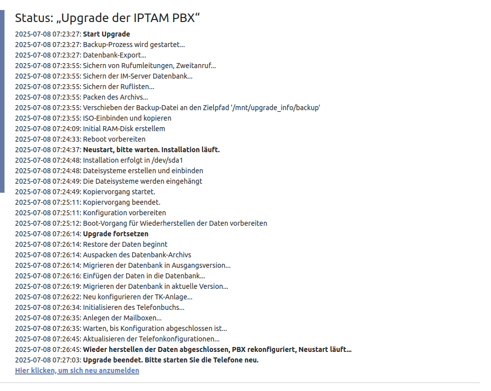 Wenn alles erfolgreich gelaufen ist (siehe rechts) starten Sie die Telefone neu, damit sie sich an der neuen IPTAM® PBX anmelden.