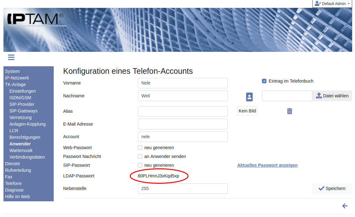 Die IPTAM® PBX verfügt über einen LDAP-Server, der den Datenbestand des Telefonbuchs per LDAP anderen Systemen in Ihrem Netz zur Verfügung stellt. Wie Sie den LDAP-Server aktivieren, finden Sie im Abschnitt „Einstellungen zum Telefonbuch“. Dieser Abschnitt gibt Hinweise, wie Sie Ihre LDAP-Clients konfigurieren, um diesen Zugang zu nutzen. Telefone, die Sie über die IPTAM® PBX automatisch konfigurieren und die diesen Zugang benötigen (wie z.B. das Konferenztelefon Snom C520 oder die Telefone des Herstellers Fanvil), benötigen keine manuellen Einstellen wie hier beschrieben.Der LDAP-Server wird über die IP-Adressse der Telefonanlage angesprochen und arbeitet auf dem Standardport 389 (unverschlüsselt oder verschlüsselt mit StartTLS) sowie auch verschlüsselt (Port 636). Die Einstellungen zur Verschlüsselung werden auf der Seite System►Verschlüsseung vorgenommen. Für die Abfrage muss sich das Telefon mit einem sog. Bind-Request am Server anmelden. Dazu wird ein Anmeldename benötigt. Dieser „DNDistinguished Name