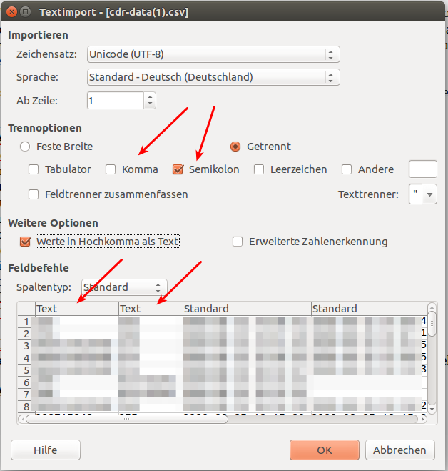 Image Importieren Sie die Verbindungsdaten in Ihrem Tabellenkalkulationsprogramm indem Sie das Semikolon als Trennzeichen angeben. Sie sollten bei den Spalten, die Rufnummern enthalten, das Format auf „Text“ ändern, damit die führenden Nullen erhalten bleiben.