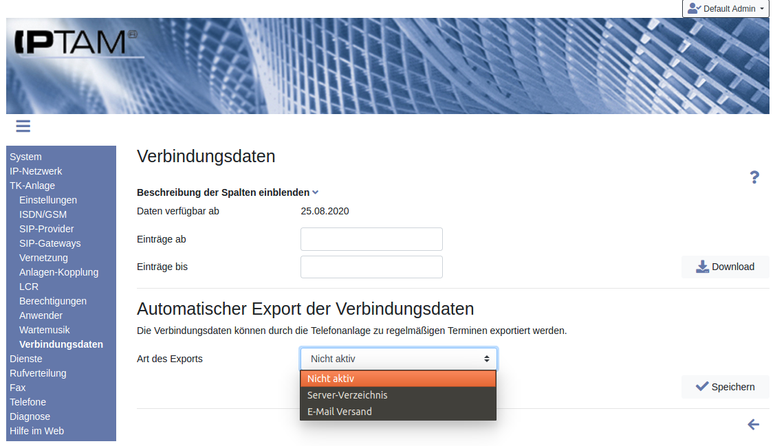 TK-Anlage►Verbindungsdaten im unteren Abschnitt (Siehe Abbildung links). Sie können die Daten auf einem Netzwerkspeicher ablegen lassen oder Sie erhalten Sie als Anhang einer E-Mail.