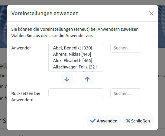 Rücksetzen“ öffnet den rechts dargestellten Dialog. Sie können so bei einzelnen Anwendern die Voreinstellungen wieder herstellen. Wenn Sie also bereits Anwender ohne die Voreinstellungen eingerichtet haben, können Sie das auf diese Weise nachholen.