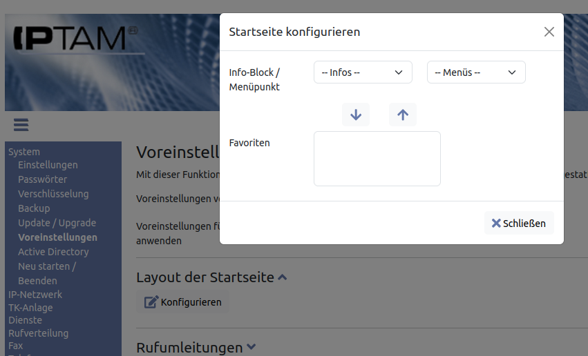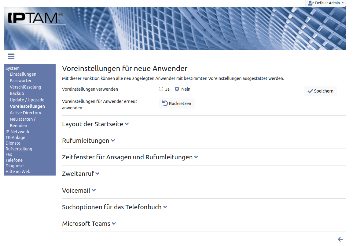 Sie können die Startseite für Anwender vorbereiten, Rufumleitungen sowie Zeitfenster für Umleitungen und Ansagen festlegen. Weitere Einstellungen umfassen Zweitanruf (Anklopfen), Voicemail sowie die Suchoptionen im Telefonbuch. Alle Voreinstellungen wirken einmalig beim Anlegen neuer Anwender.
