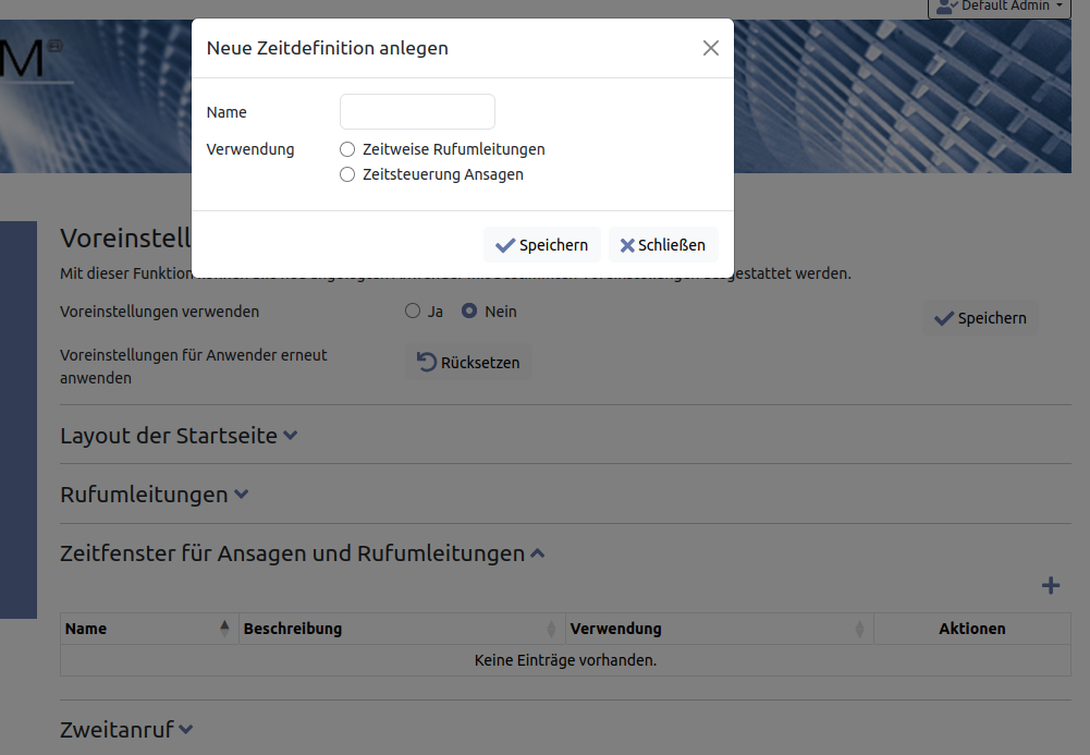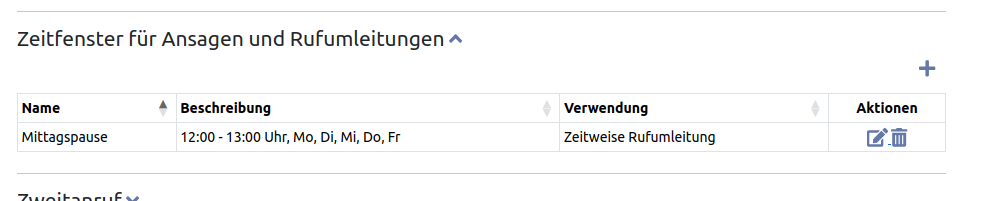 Anwender können Umleitungen zeitgesteuert aktivieren (z.B. für Pausenzeiten) oder Ansagen der Voicemail abhängig von der Zeit wechseln (siehe Anwenderhandbuch). Sie können bei den Voreinstellungen allgemeingültige Zeiträume vorgeben. Ihre Anwender können diese anhand des Namens auswählen und müssen nicht jeder die Zeiteinstellungen selbst vornehmen. Klicken Sie bei „Zeitfenster für Ansagen und Rufumleitungen“ auf das Icon