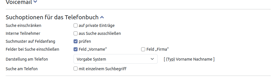 Im Anwenderhandbuch ist beschrieben, wie die Suche im Telefonbuch beeinflusst werden kann. Sie können z.B. den Vornamen oder die Firma ein oder ausschließen. Rechts sehen Sie die Einstellungen, die Sie ganz analog als Vorgabe festlegen können.