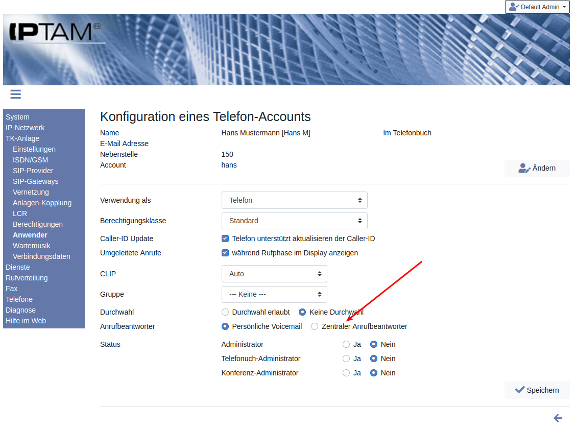 Neben der persönlichen Mailbox gibt es auch den zentralen Anrufbeantworter. Wenn Sie diesen aktivieren, können Sie für jeden Anwender festlegen, ob die persönliche Mailbox oder der zentrale Anrufbeantworter verwendet werden soll.