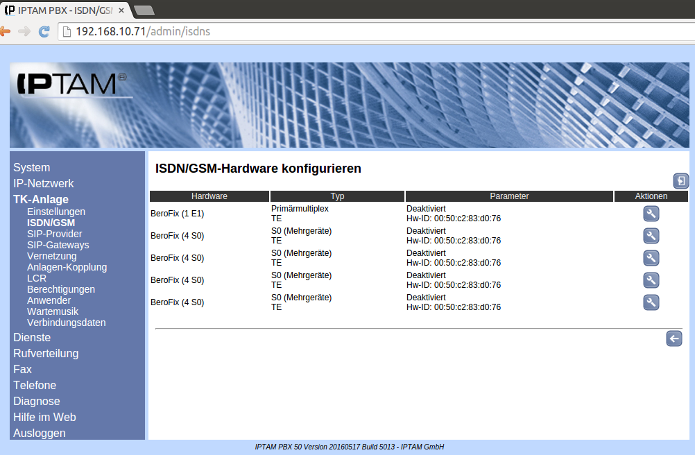 Die IPTAM® PBX unterstützt die internen Mediengateways berofix automatisch. Die Karten werden beim Systemstart erkannt und stehen dann zur Konfiguration zur Verfügung. Die einzelnen Schnittstellen finden Sie im Menü TK-Anlage ► ISDN/GSM. Die ISDN Schnittstellen können als Anschluss zum öffentlichen Netz im TE Modus ebenso eingesetzt werden wie auch als interne Schnittstellen im NT Modus. Die analogen Schnittstellen (FXS) werden ebenso wie die Mobilfunk Schnittstellen in der Liste aufgeführt.Im Diagnosebereich unter Diagnose ► ISDN/GSM finden Sie neben dem Status der Schnittstellen auch die Möglichkeit, die Firmware des Gateways zu aktualisieren oder die Karte neu zu starten.