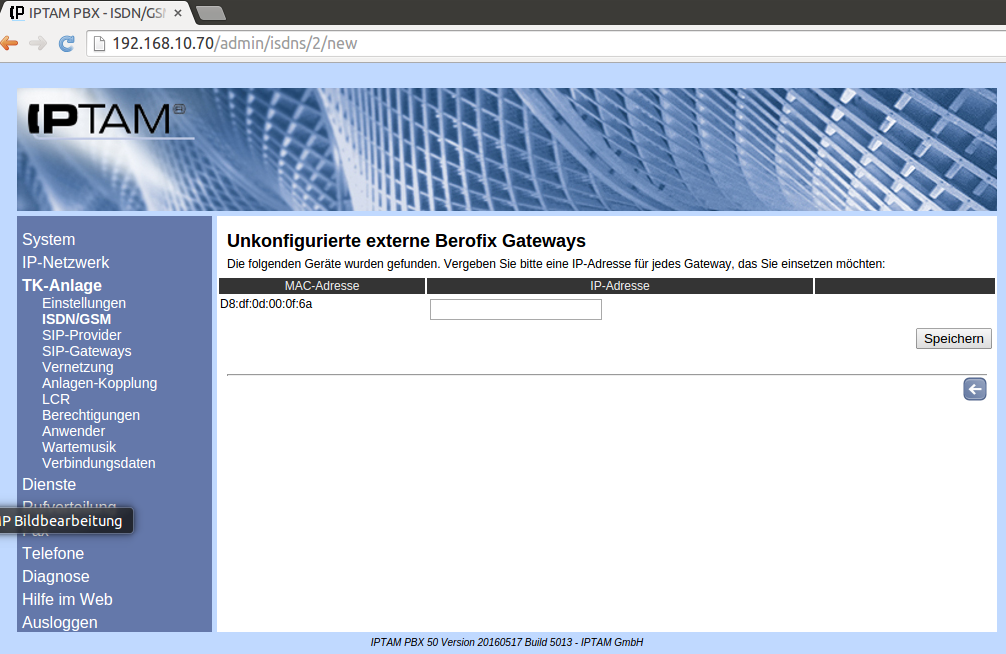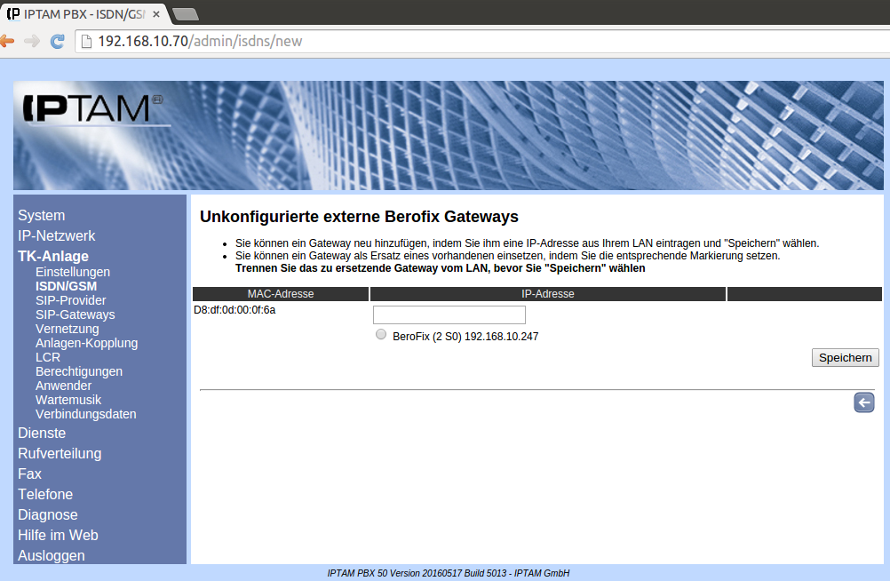 Die IPTAM® PBX ermöglicht auch den einfachen Einsatz der berofix Mediengateways als externe Box. Verbinden Sie das Gateway mit einem freien Port in Ihrem LAN im gleichen Segment wie die Telefonanlage (gleiche Broadcast-Domain) und stellen Sie die Spannungsversorgung her. Sie brauchen keine Konfiguration am Gateway vorzunehmen.Im Diagnosebereich unter Diagnose ► ISDN/GSM finden Sie neben dem Status der Schnittstellen auch die Möglichkeit, die Firmware des Gateways zu aktualisieren oder die Karte neu zu starten.