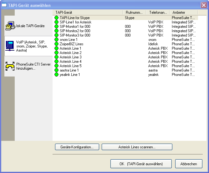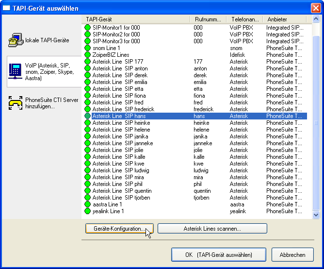 Wählen Sie jetzt eines der TAPI-Geräte aus und klicken Sie auf „Geräte-Konfiguration“.