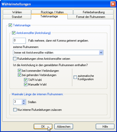 Für die korrekte Behandlung von Rufnummern benötigt die CTI-Software Informationen zu Ihrem Standort. Tragen Sie also Landeskennziffer, Ortsnetzkennzahl sowie die Stammrufnummer Ihrer Telefonanlage ein.