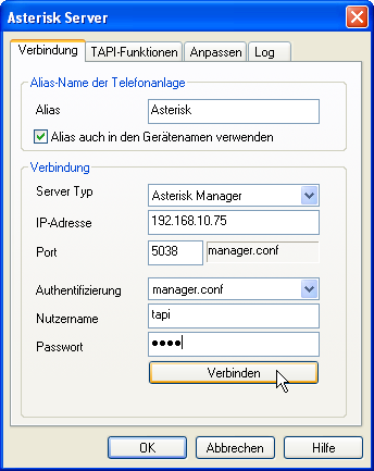 Tragen Sie im nebenstehenden Dialog die Parameter zur Kommunikation zu Ihrer IPTAM® PBX ein: Neben der IP-Adresse der Telefonanlage sind dies Nutzername und Passwort (vgl. Dialog in der Web-Oberfläche der IPTAM® PBX unter Dienste ► TAPI). Klicken Sie auf „Verbinden“, um die Verbindung zu testen und anschließend auf „OK“.