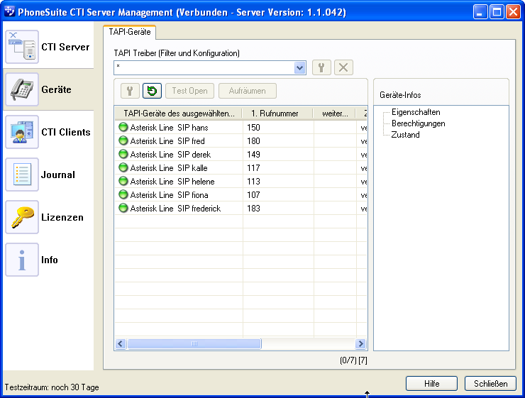 Beim ersten Start im Rahmen der Installation erscheint direkt die Ansicht „Geräte“, die die im System bekannten TAPI-Geräte auflistet.