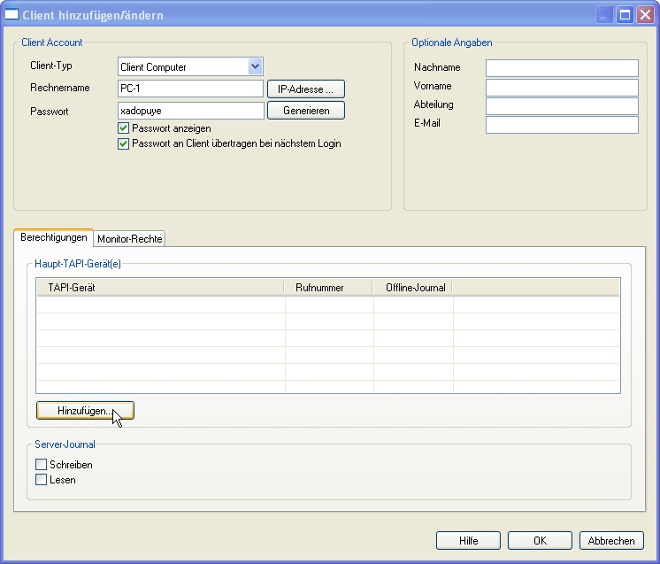 Damit CTI-Clients den Server nutzen können, müssen Sie die Clients im Server bekannt machen und die Rechte festlegen. Klicken Sie auf das „+“-Zeichen in der Ansicht „CTI-Clients“ (Abbildung links) und in der daraufhin angezeigten Maske auf „Hinzufügen“ (Abbildung rechts).