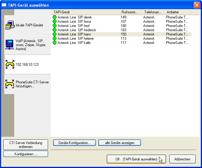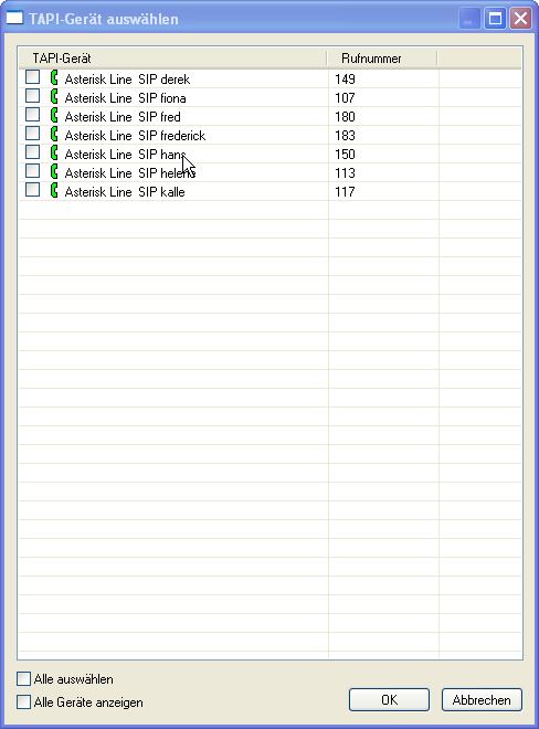 Markieren Sie die TAPI-Leitungen (Nebenstellen), die vom Client nutzbar sein sollen und übernehmen Sie die Auswahl durch „OK“.