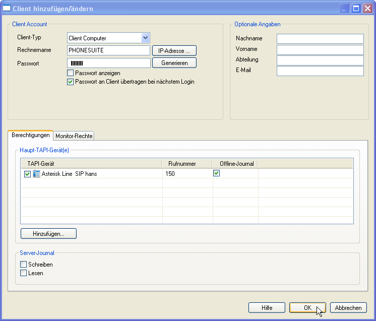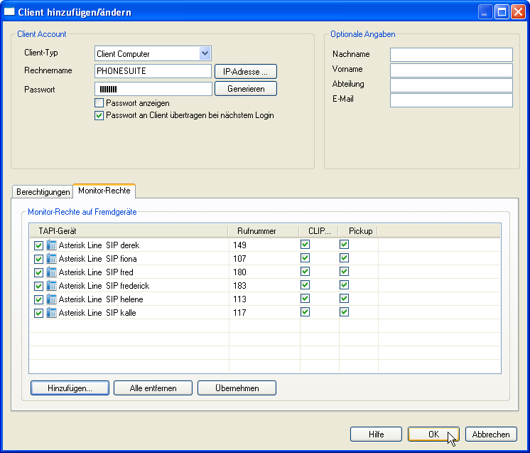 Wählen Sie ggf. Rechte für das Monitoring anderer Nebenstellen aus, indem Sie den Reiter „Monitor-Rechte“ anklicken und die Auswahl der TAPI-Leitungen analog ausführen.