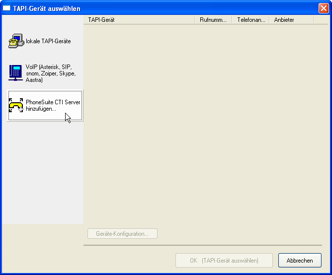 Beim ersten Start der Anwendung gelangen Sie in den Dialog zur Erstkonfiguration. Klicken Sie auf „Telefonkonfiguration“. Sie erhalten eine Übersicht der für die Anwendung vorgesehenen TAPI-Geräte, die zunächst leer ist. Klicken Sie auf „Hinzufügen“.
