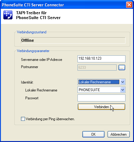 Klicken Sie in der Navigation auf „Phonesuite CTI-Server hinzufügen“. Tragen Sie in dem Dialog (Abbildung rechts) die IP-Adresse des CTI-Servers ein und wählen Sie das im Server für diesen Client hinterlegte Authentifizierungsschema (Username oder Rechnername). Klicken Sie auf „Verbinden“ und „OK“.
