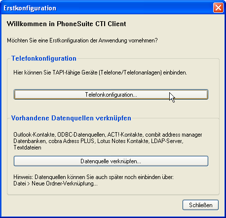 Sie können nun die Erstkonfiguration des CTI-Clients beenden oder die Verknüpfung mit Datenquellen durchführen. Weitere Hinweise zu den vielfältigen Möglichkeiten finden Sie in der Dokumentation der PhoneSuite®.