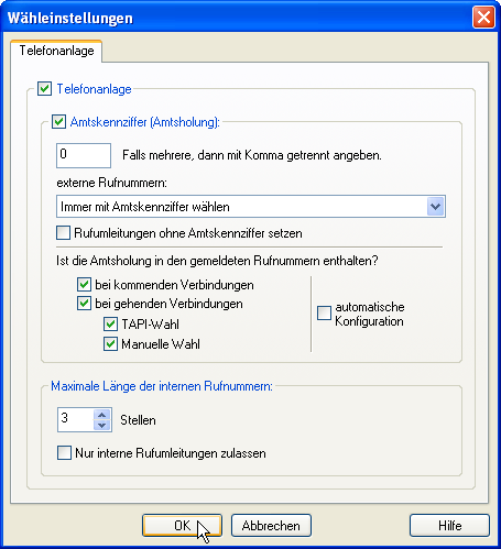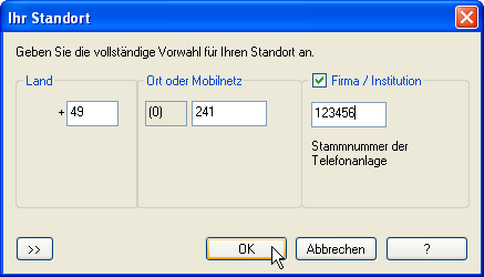 Für die korrekte Behandlung von Rufnummern benötigt die CTI-Software Informationen zu Ihrem Standort. Tragen Sie also Landeskennziffer, Ortsnetzkennzahl sowie die Stammrufnummer Ihrer Telefonanlage ein.