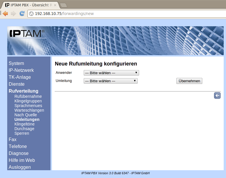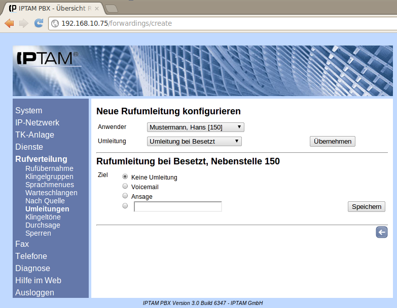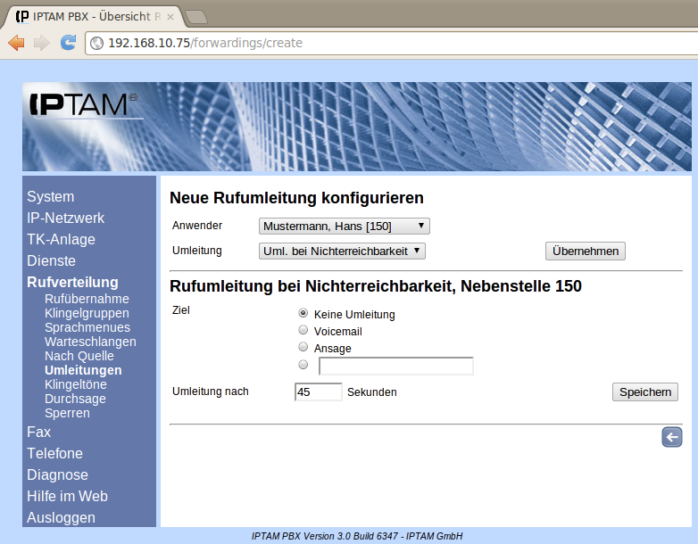 Die IPTAM® PBX verfügt über unterschiedliche Rufumleitungsszenarien. Die Umleitung leitet den Anrufer jeweils zu einer anderen Nebenstelle, einem externen Ziel, dem Anrufbeantworter des Anwenders oder zu einer Ansage. Es werden nur Anrufe umgeleitet, die direkt an einen Anwender gerichtet sind:- Permanente Umleitung